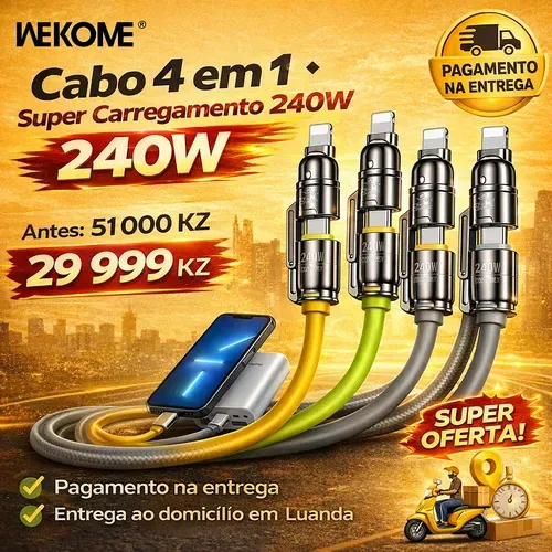 Cabo 4 em 1 WEKOME com silicone líquido, carregamento rápido para vários dispositivos. Pagamento contra entrega · Entrega ao domicílio (Luanda)